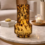 Made from dark amber glass with rich tonal patterns, its bold silhouette makes an instant focal point. Offering a modern take on vintage design, it captivates from every angle with warmth and character.