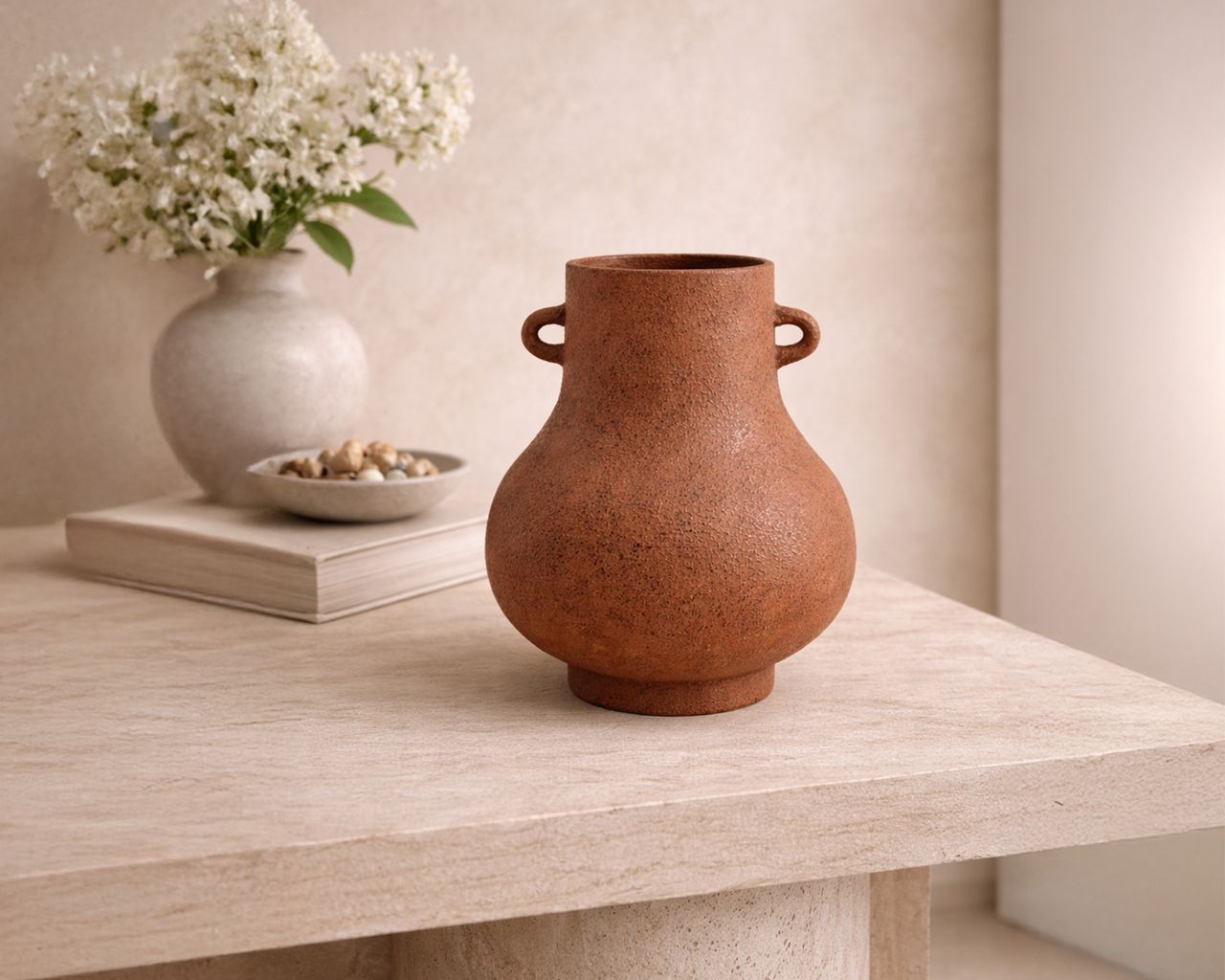 Crafted from terracotta-coloured ceramic, its bulbous form is accented by twin loop handles that nod to traditional pottery while maintaining a contemporary edge. The earthy red tone and raw finish offer a grounded, organic aesthetic that is ideal for adding texture and character to minimalist or nature-inspired spaces.