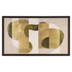 Set within a sleek black frame, the composition layers bold green and radiant gold accents over a soft neutral backdrop. The mix of vertical and horizontal lines with organic forms creates a striking aesthetic that feels both abstract and modern.