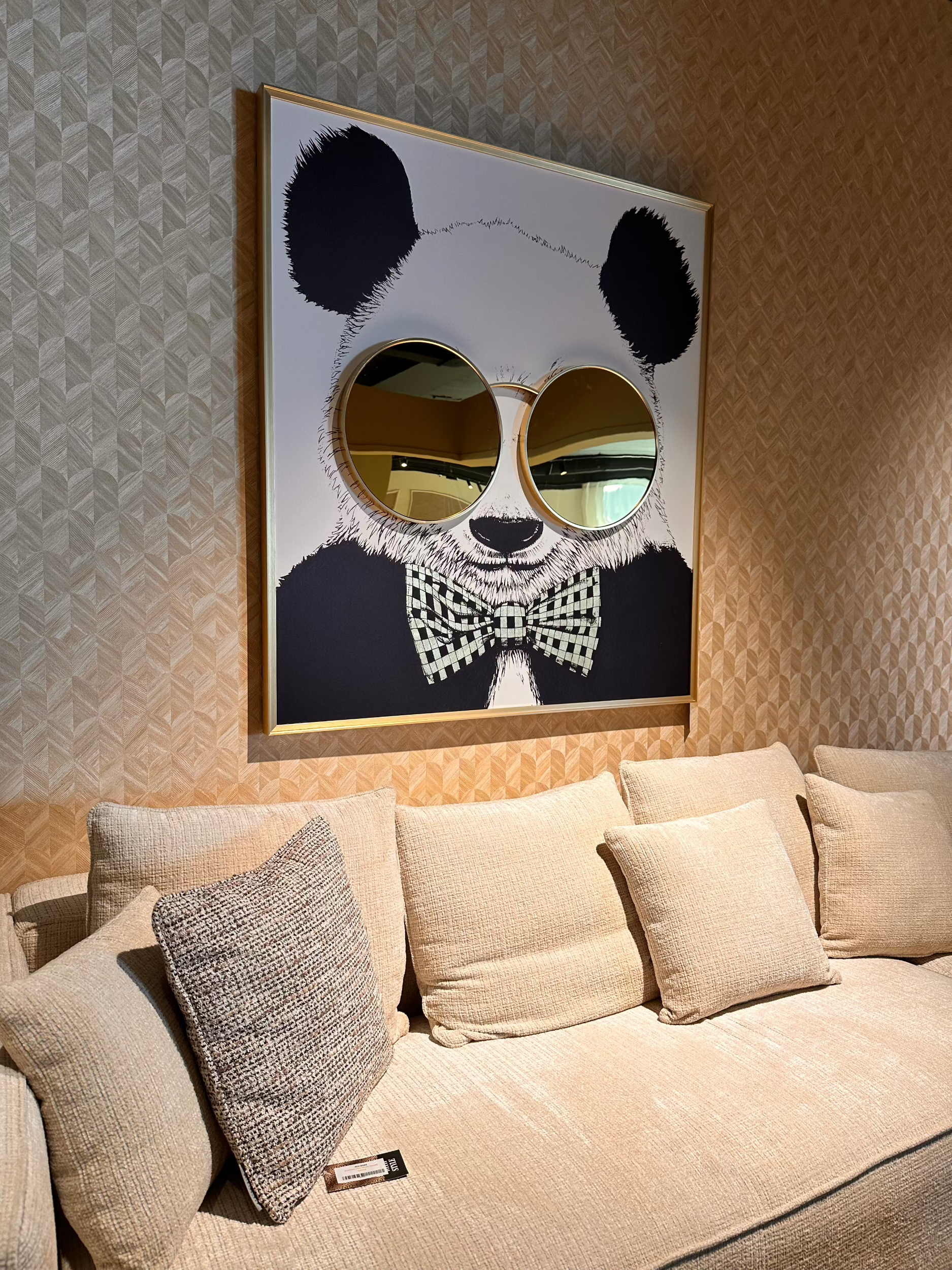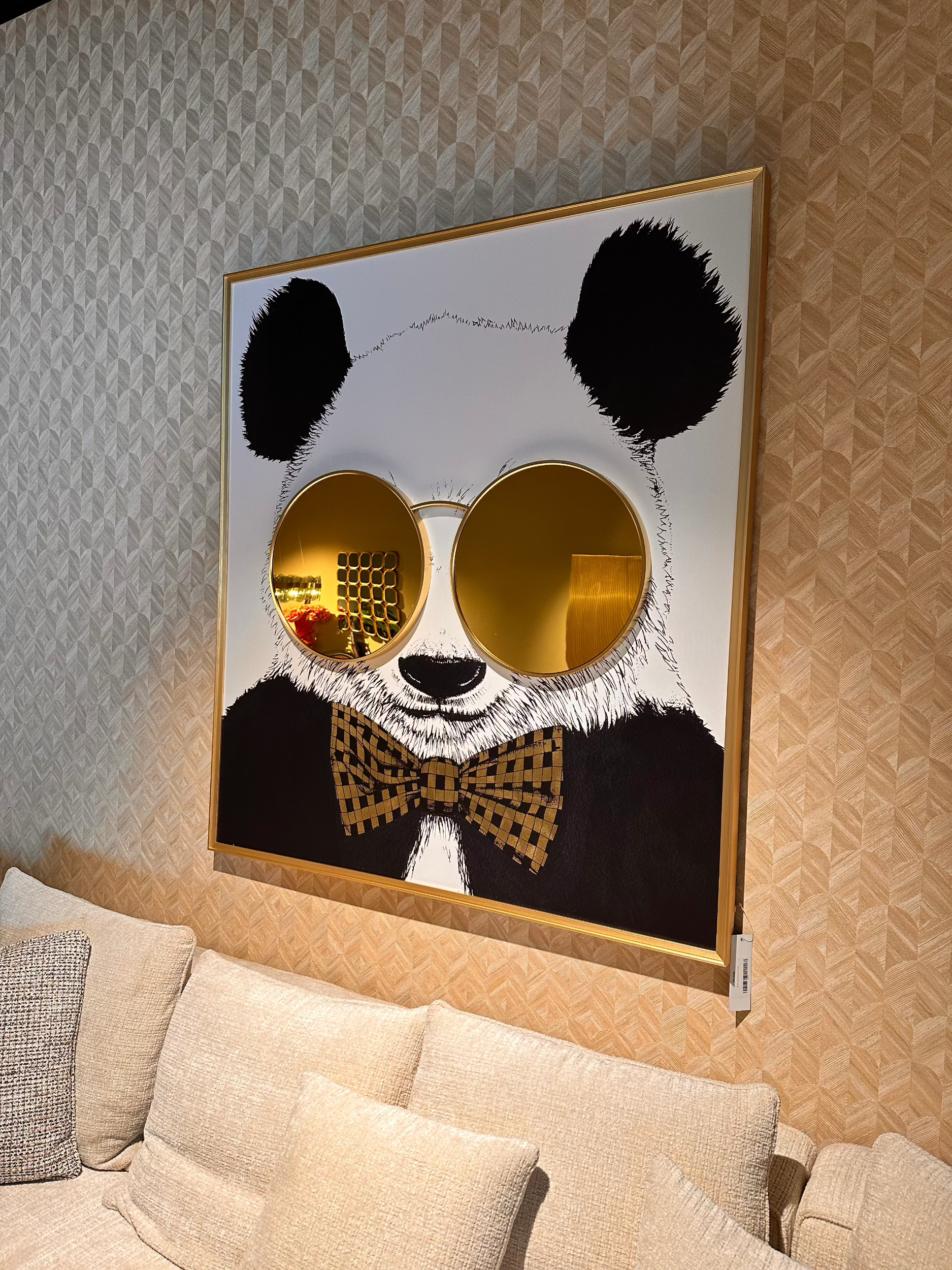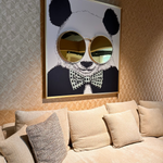 Encased in a sophisticated golden frame, this artwork features a stylish panda adorned with a gold-checked bow tie and oversized mirrored glasses, cleverly interacting with the light to produce a dazzling effect. This piece instantly becomes the centrepiece of any wall it finds itself on, offering a unique blend of whimsy and elegance.