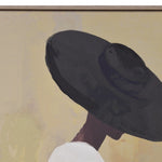 Depicting a figure in a flowing white dress and wide-brimmed black hat seated atop a horse, this piece evokes quiet confidence and timeless style. The soft, neutral background contrasts with the figure’s bold silhouette, enhancing the composition’s calm, contemplative atmosphere.