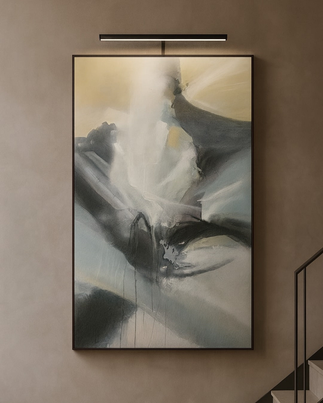 Hand-finished with sweeping brushstrokes in smoky greys, soft whites, and muted golds, this striking oil painting conveys a sense of movement and emotional depth. Its dynamic composition makes it an ideal focal point for contemporary living rooms, bedrooms, or hallways, where it brings balance and intrigue in equal measure.