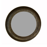 Its round aluminium frame features a beautifully aged antique gold finish that captures the look of time-worn elegance. The subtly weathered surface and deep, sculptural edge lend a tactile quality that draws the eye and adds depth to any wall.