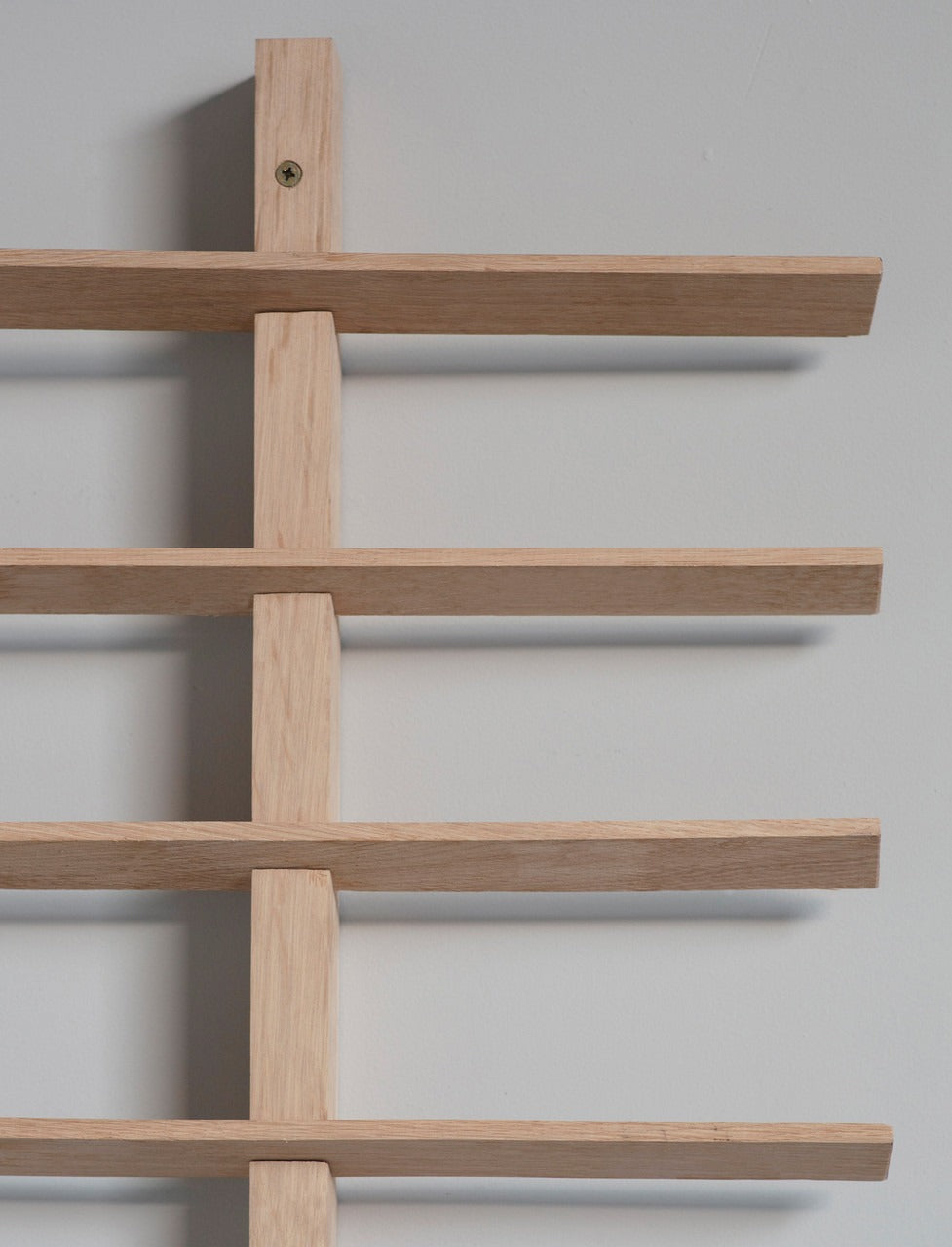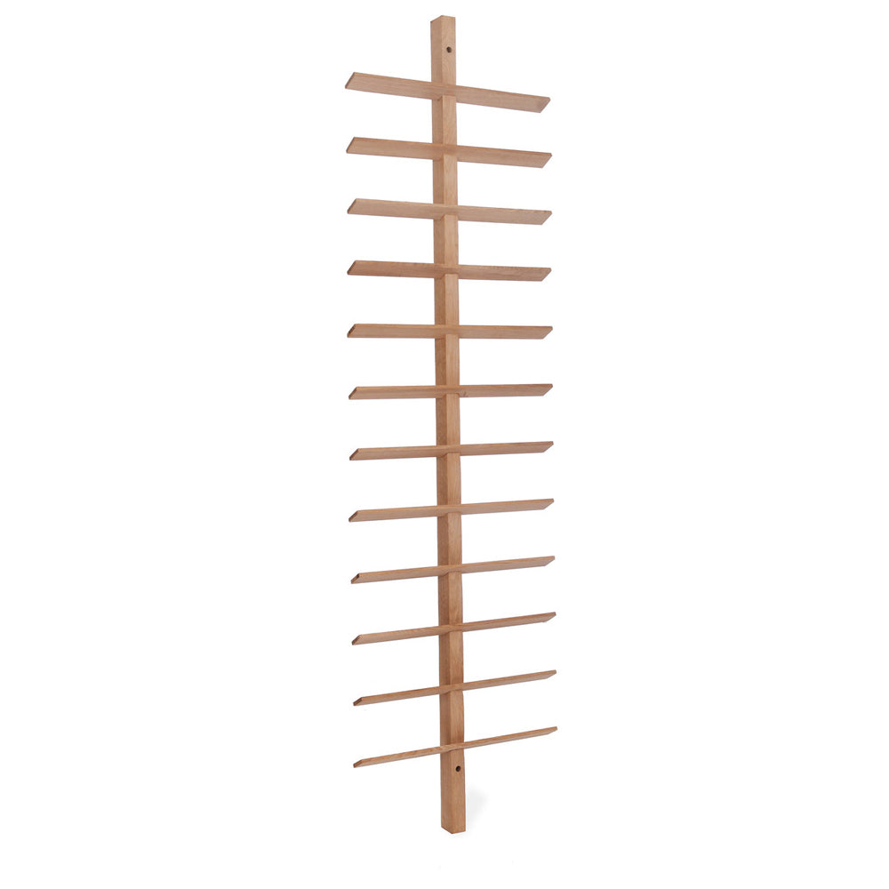 Crafted from raw oak, this minimalist wall-mounted rack offers an elegant solution for displaying your treasured wine collection. Its vertical design saves space while adding a sophisticated touch to any kitchen, dining area, or living space. With room to hold up to twenty-four bottles, it combines functionality with style, making it perfect for both wine enthusiasts and casual collectors.