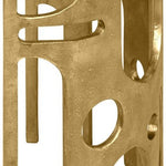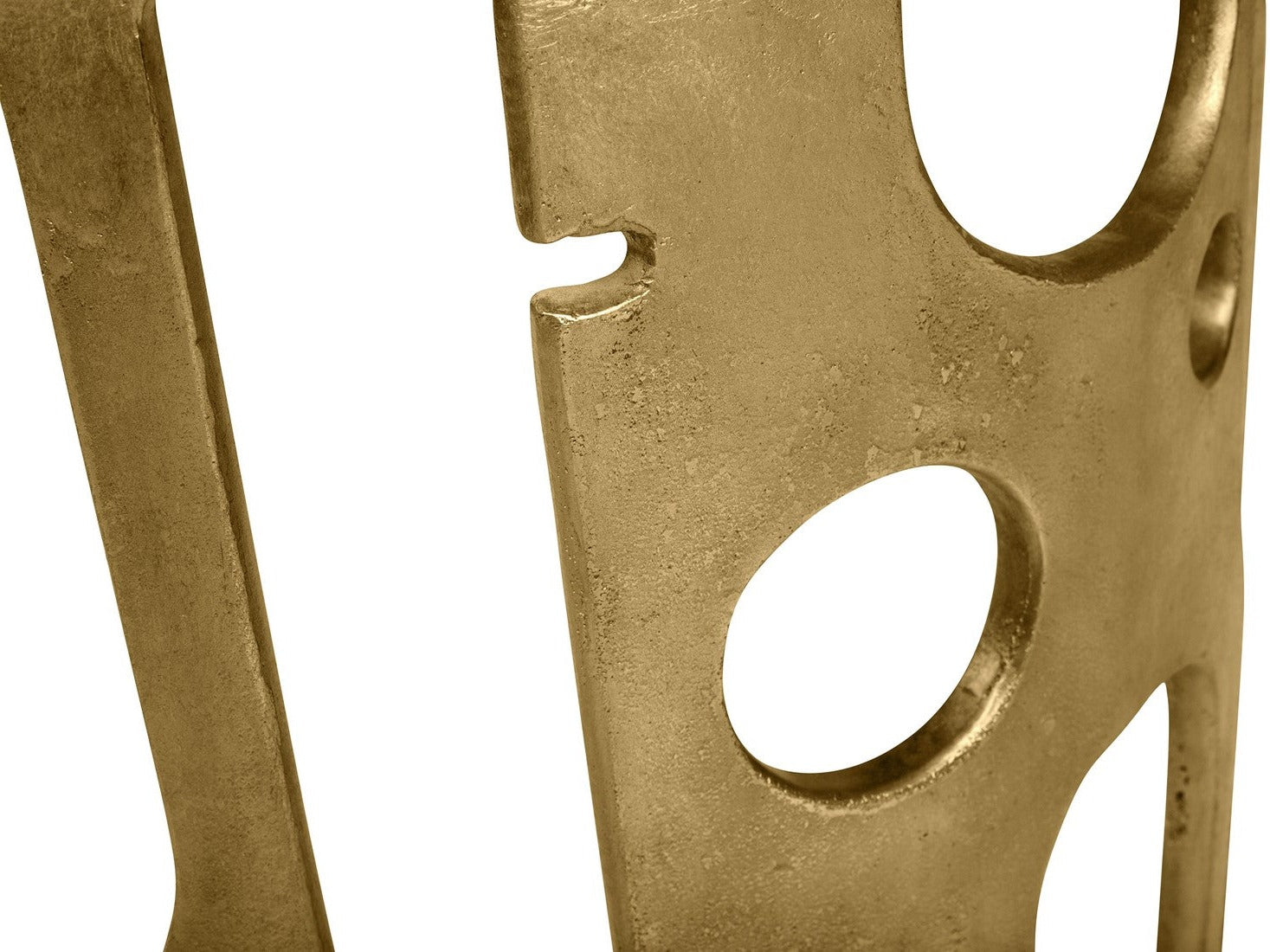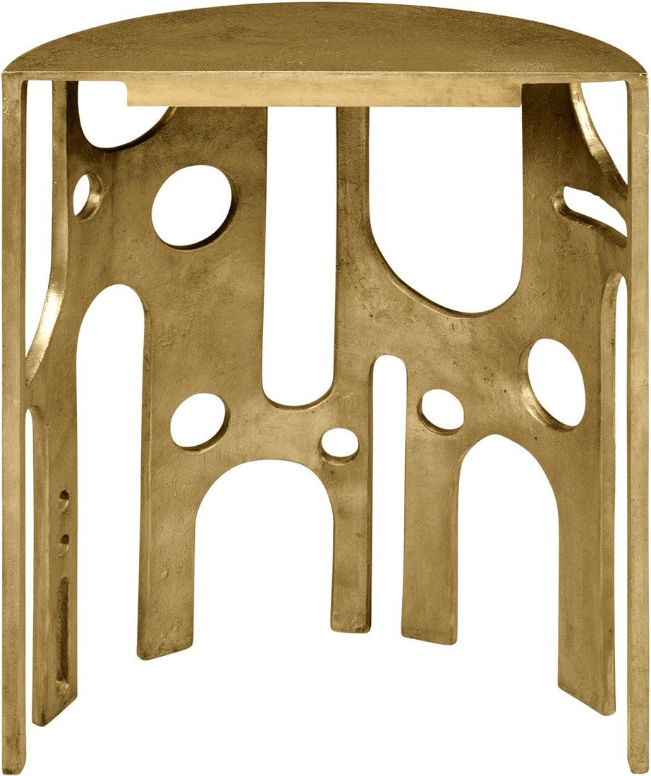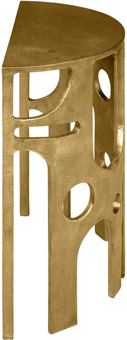 Masterfully handcrafted from aluminium, it showcases a bronzed finish that exudes an air of understated luxury. Its table top, beautifully fashioned into a half-moon shape, sits flush against the wall, allowing for a seamless fit into your space. The base, featuring a distinctive keyhole design and perforations across the side, lends an edgy, repurposed aesthetic, reminiscent of reclaimed industrial machinery.