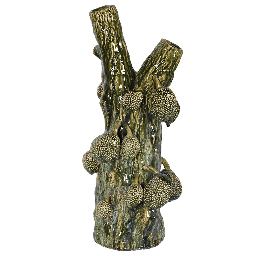 Crafted from ceramic, this exquisite vase depicts a stunning decoration of breadfruit hanging delicately from textured tree branches that form the necks of the vase. Finished in a deep green glaze, its organic appeal is accentuated, making it a captivating feature piece that embodies nature's beauty in its design.