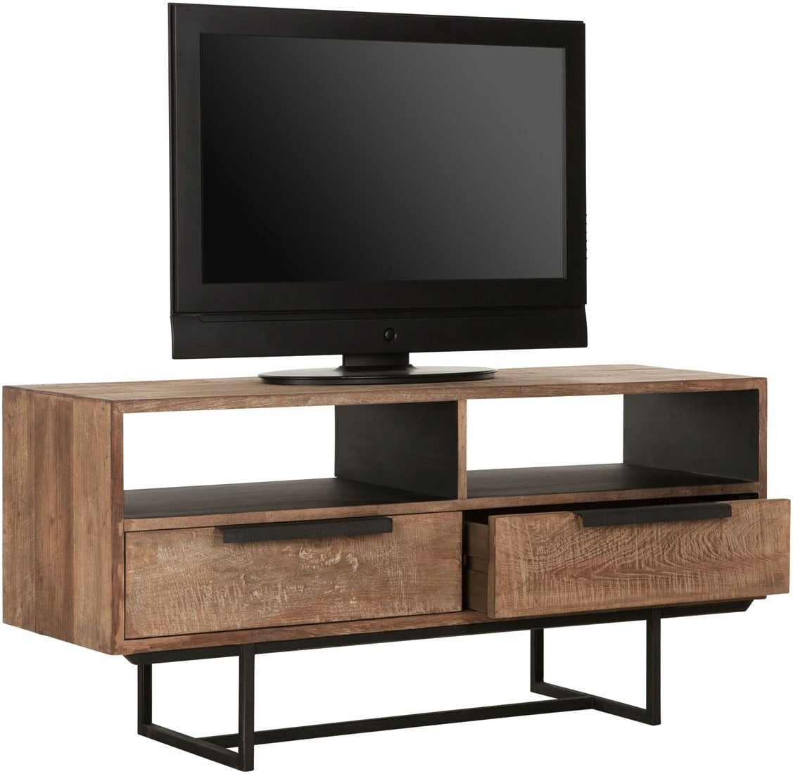 Enhanced by the natural beauty and unique grain of the wood, this tv unit captures the essence of rustic charm. Featuring two spacious drawers and two open shelves, it provides ample storage for all your media essentials, keeping your space organised and tidy whilst the robust metal frame ensures stability and adds a touch of industrial flair.