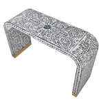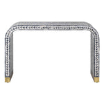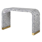 Featuring intricate resin and buffalo bone inlay, it showcases a delicate floral design that introduces exotic charm to any room. The curved form adds a modern touch, while brass-capped feet lend a refined, polished finish. Ideal for entryways, hallways, or as a statement piece in your living room, this console table embodies timeless artistry.