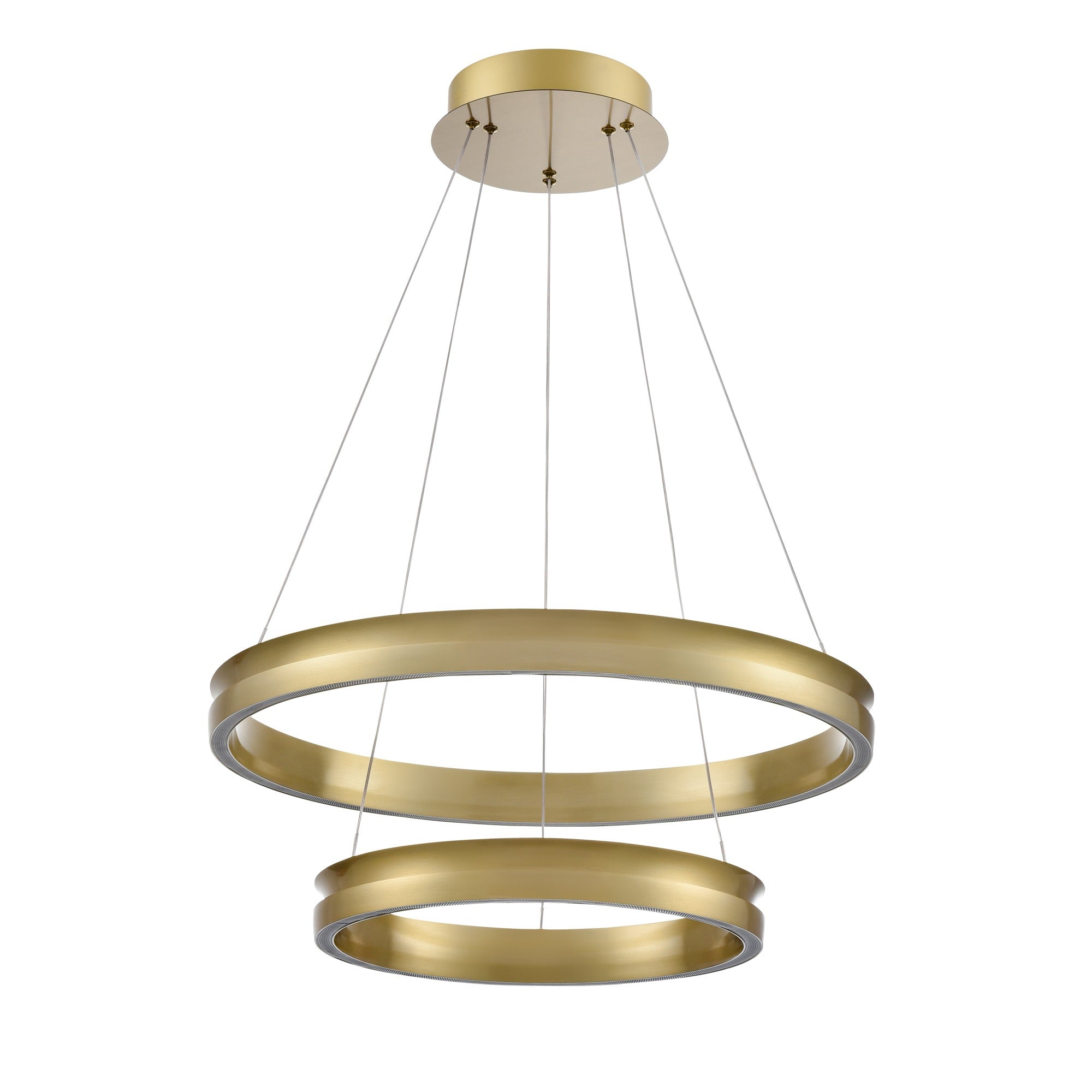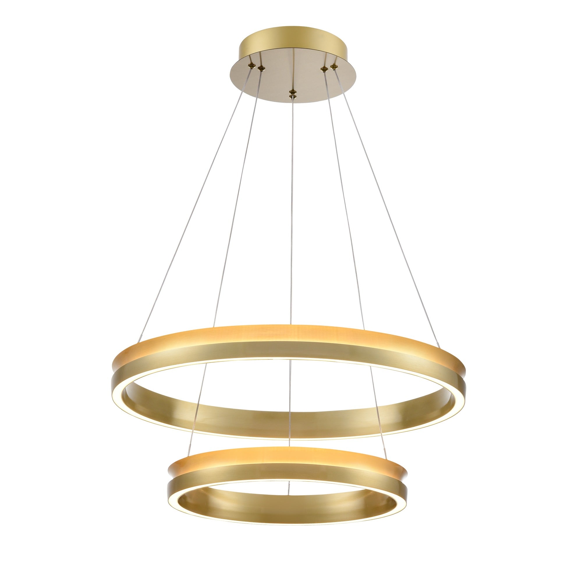 Suspended by fine, discreet wires, it features a satin brass metal ring that casts a soft, ambient glow from its integrated LED light source. The clean circular form and tiered design brings a sense of balance and refinement, making it ideal for modern dining areas, lounges, or entrance halls. Compatible with trailing-edge dimmers, it allows you to adjust the brightness to create the perfect atmosphere for any moment.