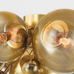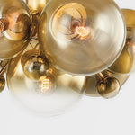 Featuring a cluster of glass orbs in varying sizes, each transitioning from polished brass to clear glass, it creates a captivating ombre effect that emits a warm, ambient glow. This fixture’s unique design brings sophistication and visual intrigue to any space, whether modern, traditional, or a blend of styles.