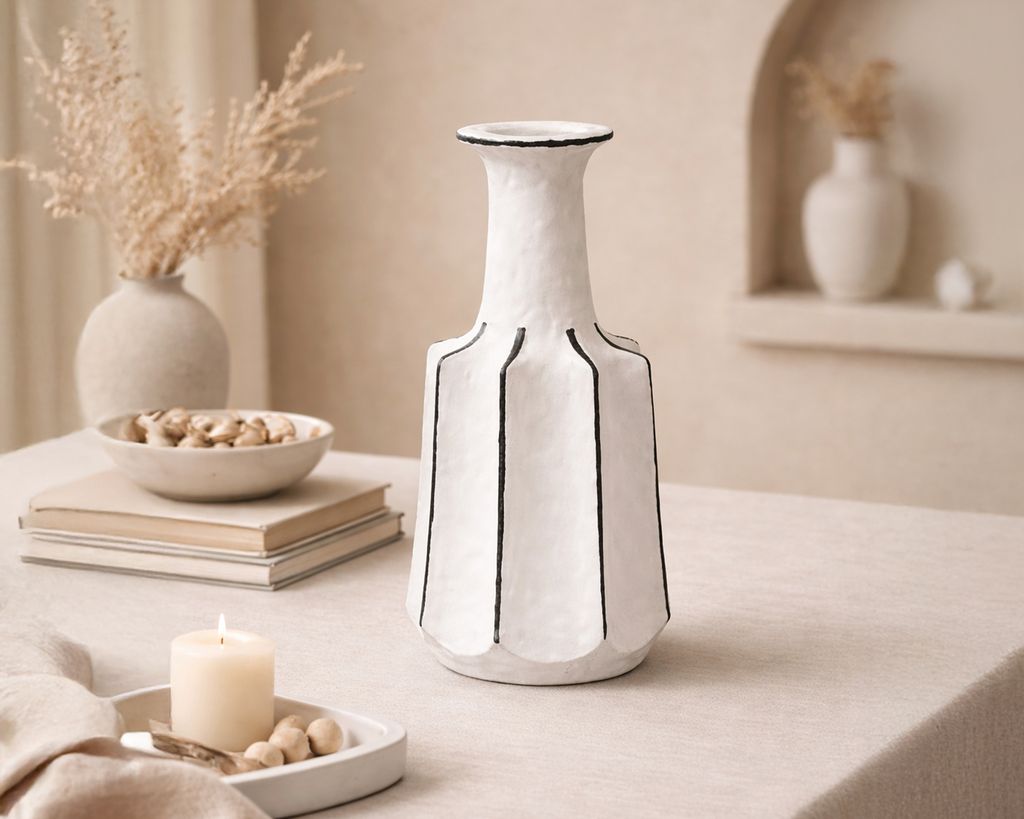 Crafted from white ceramic with black accents, its clean lines and angular form are softened by a lightly textured surface, giving it artisanal charm. The striking contrast of black on white allows it to stand out against any backdrop.