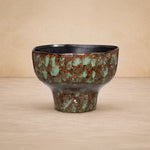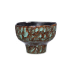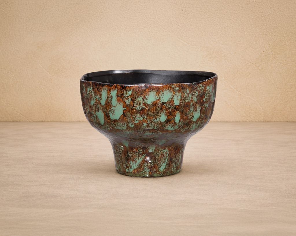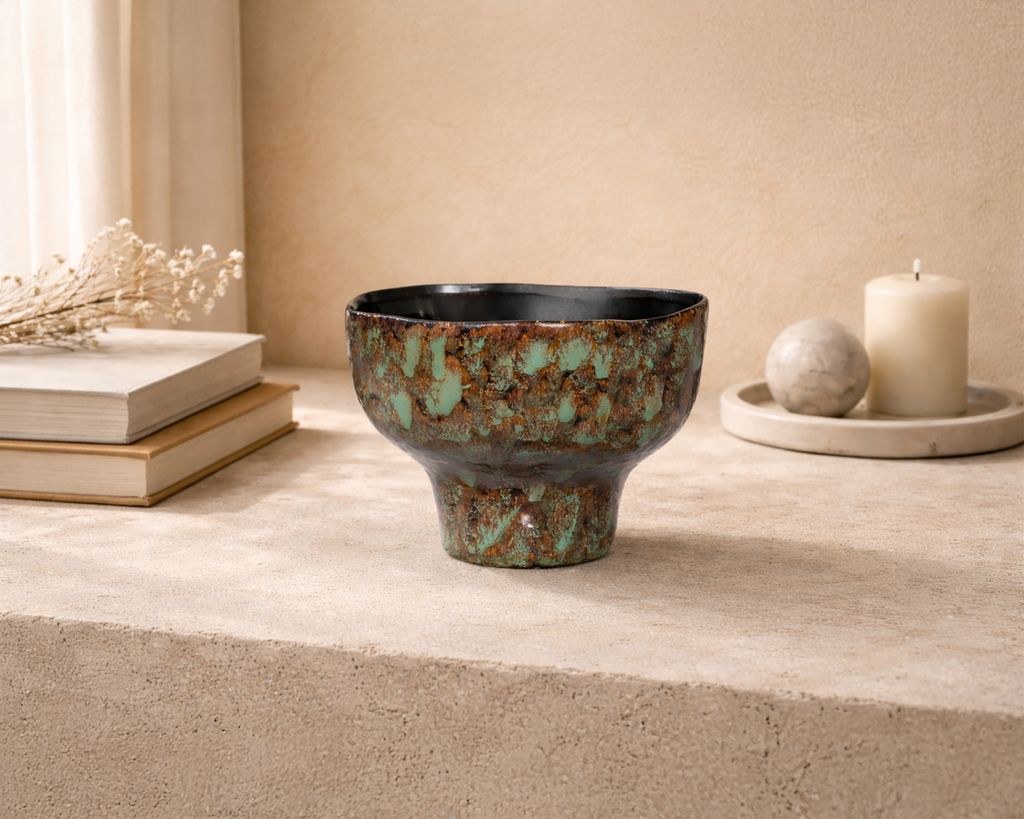 Its captivating brown and turquoise glazed ceramic finish evokes the look of weathered patina, lending an aged, old-world charm. Both stylish and functional, it can be left empty as a sculptural piece or filled with everyday essentials or decorative stones.