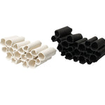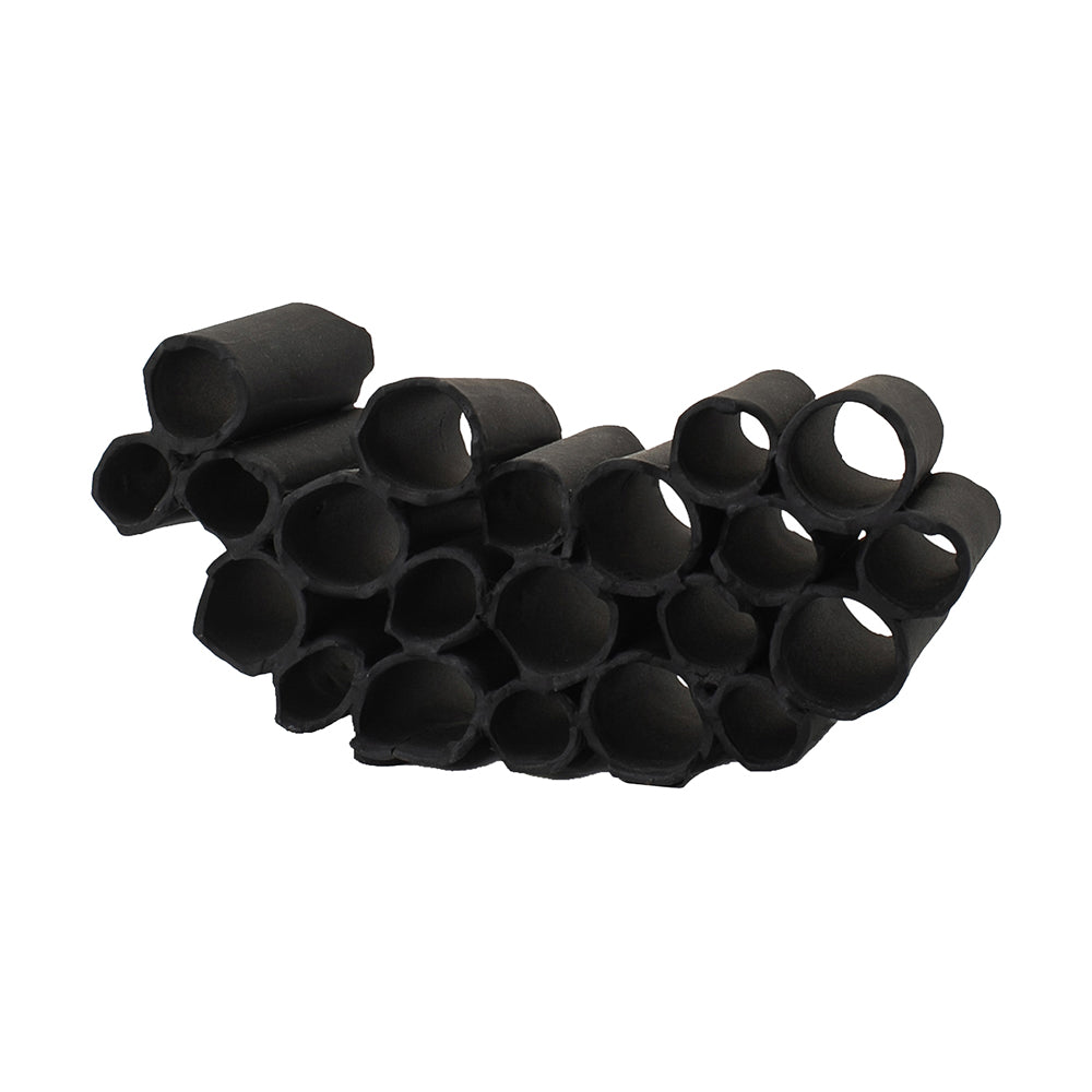 This captivating sculpture consists of numerous black ceramic tubes, meticulously stacked to form a cohesive and striking silhouette with the rough, uneven edges adding a rustic touch to its otherwise sleek design.