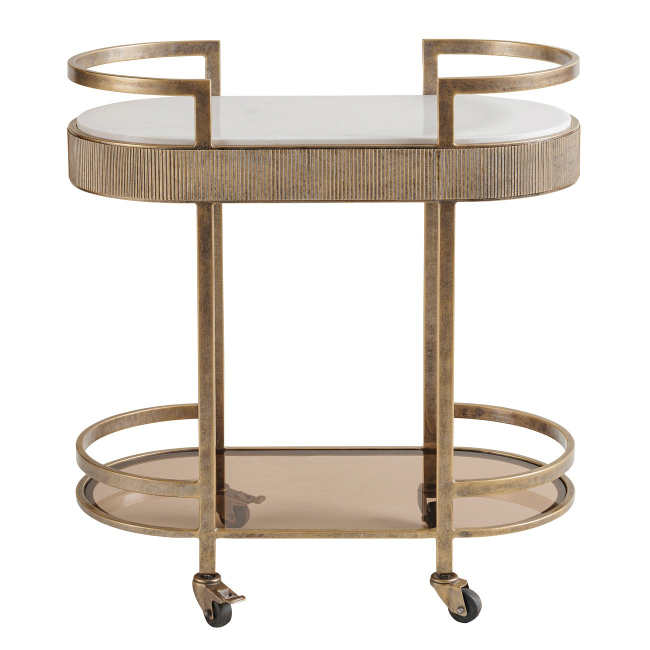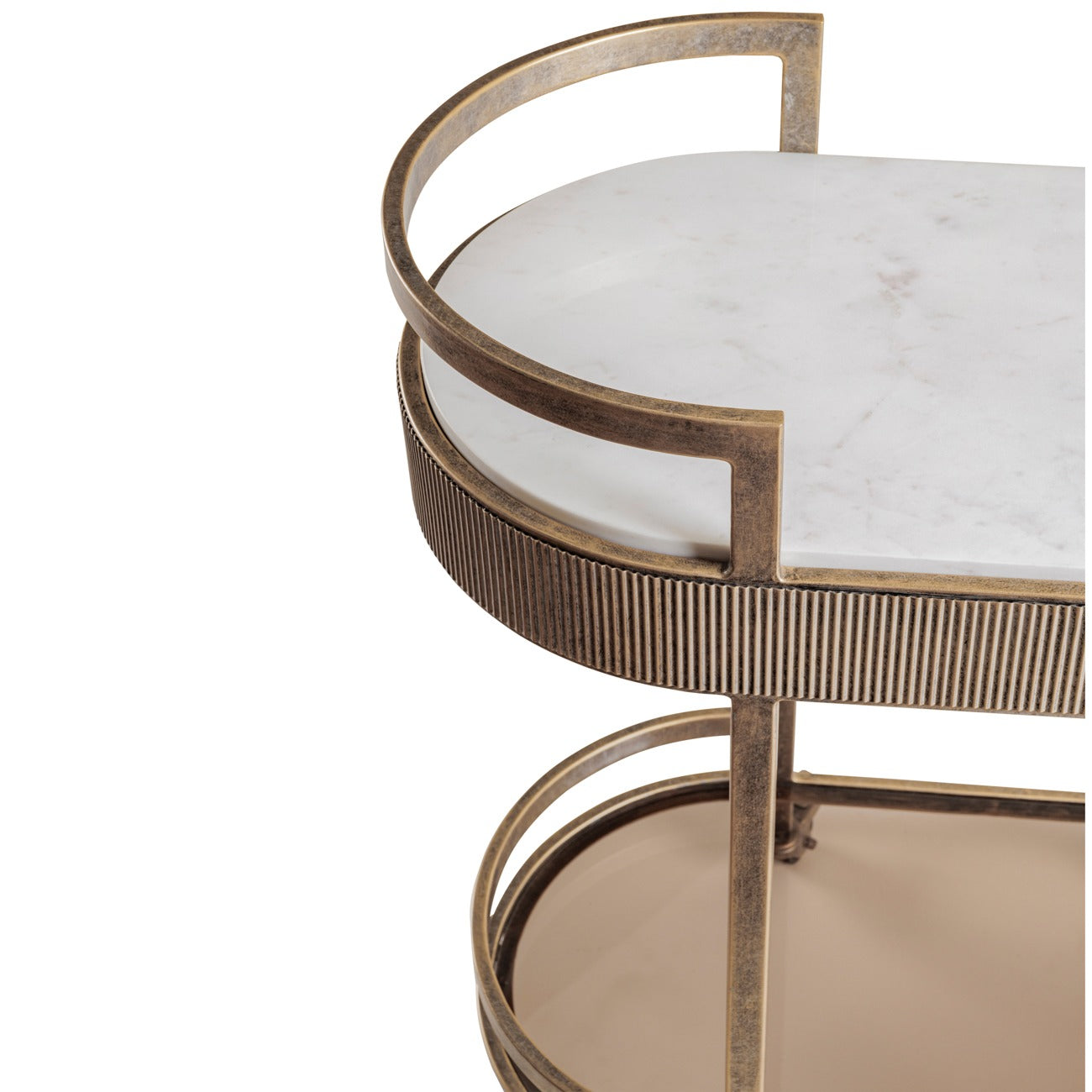 Set upon four castor wheels for effortless movement, this exquisite piece channels Art Deco sophistication with its iron frame, corrugated detailing, and aged gold finish. The lower shelf features tinted glass, while the top is crafted from smooth white Banswara marble, creating a refined contrast of tone and texture.