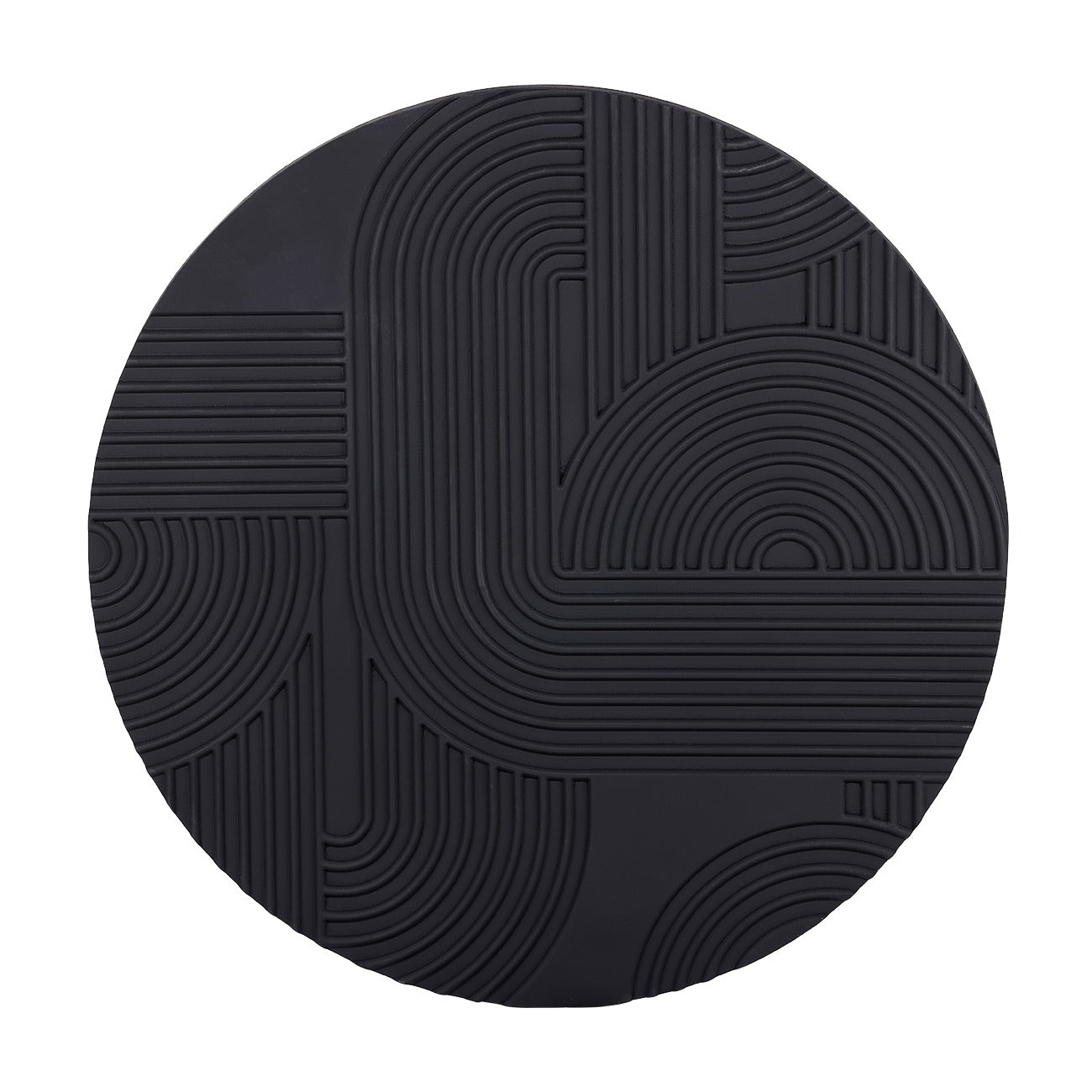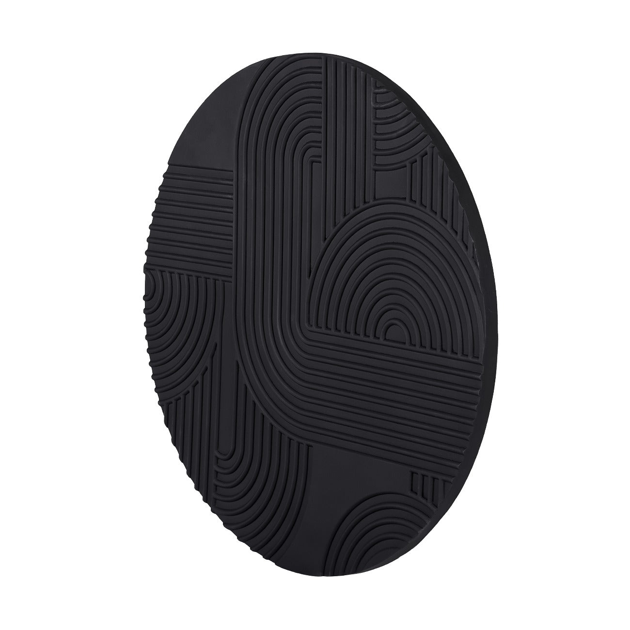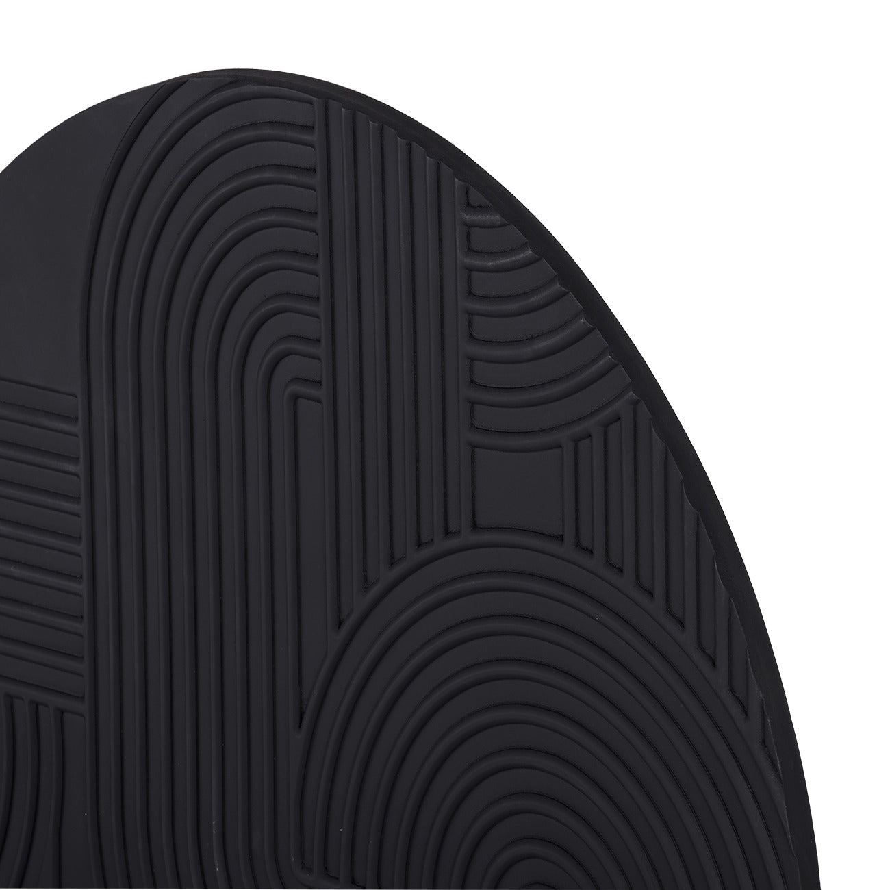 Crafted from matte black wood with embossed detailing, it showcases a geometric composition of grooved, arched lines inspired by brutalist and contemporary minimalist design. The deep black finish allows the sculptural form to take centre stage, subtly catching the light to accentuate its carved texture.