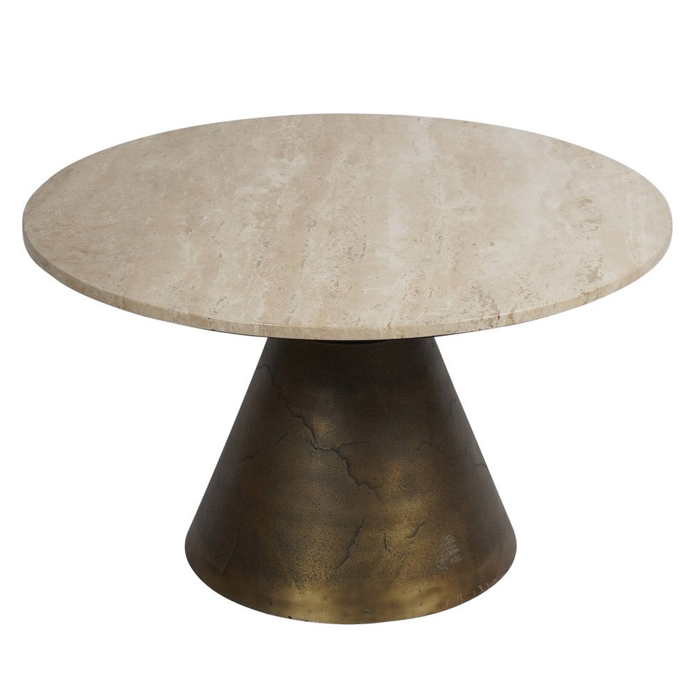 Standing on a robust conical base made from antique brass metal, it provides a striking contrast to the lavish light travertine tabletop above which adds a warm, natural aesthetic to any living room or conservatory. With its blend of colours and materials, it effortlessly complements a wide range of interior styles, from sleek contemporary to luxurious Art Deco-inspired environments.