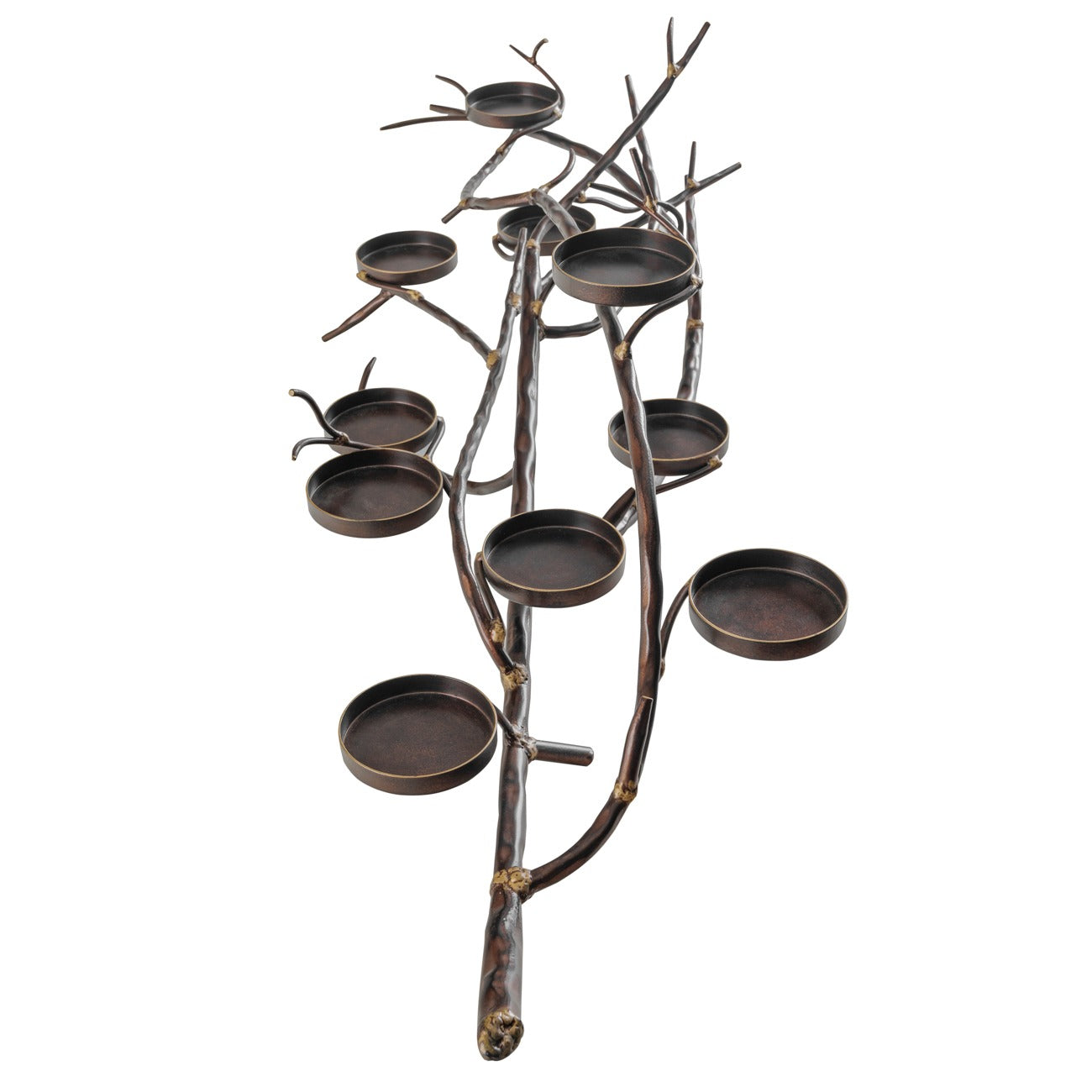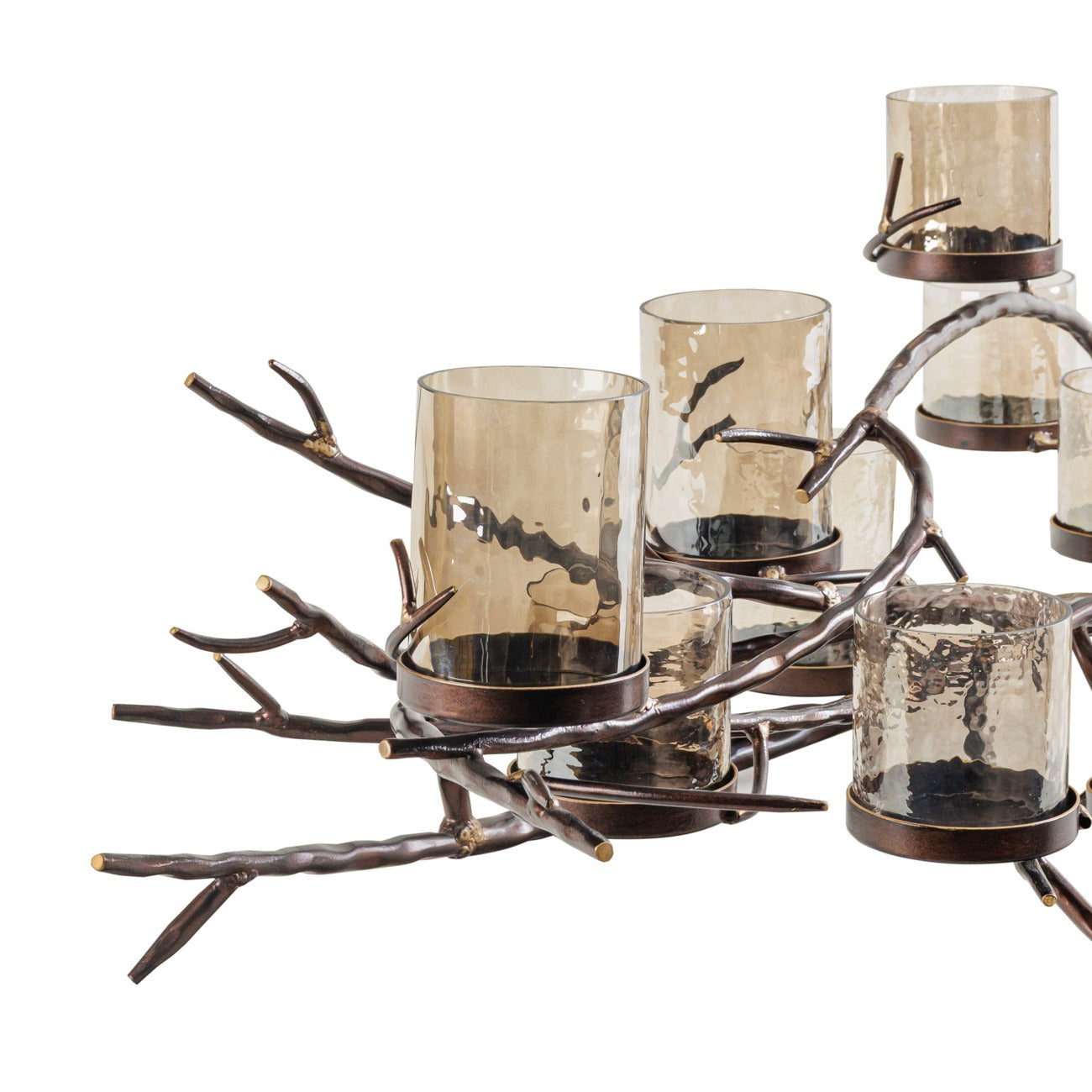 Twisting, branch-like metal arms hold eleven dappled glass holders, forming a stunningly organic silhouette that draws the eye in an instant. Finished in a warm copper-brown tone, it brings texture and depth to any setting, whether styled on a dining table, sideboard, or mantelpiece.