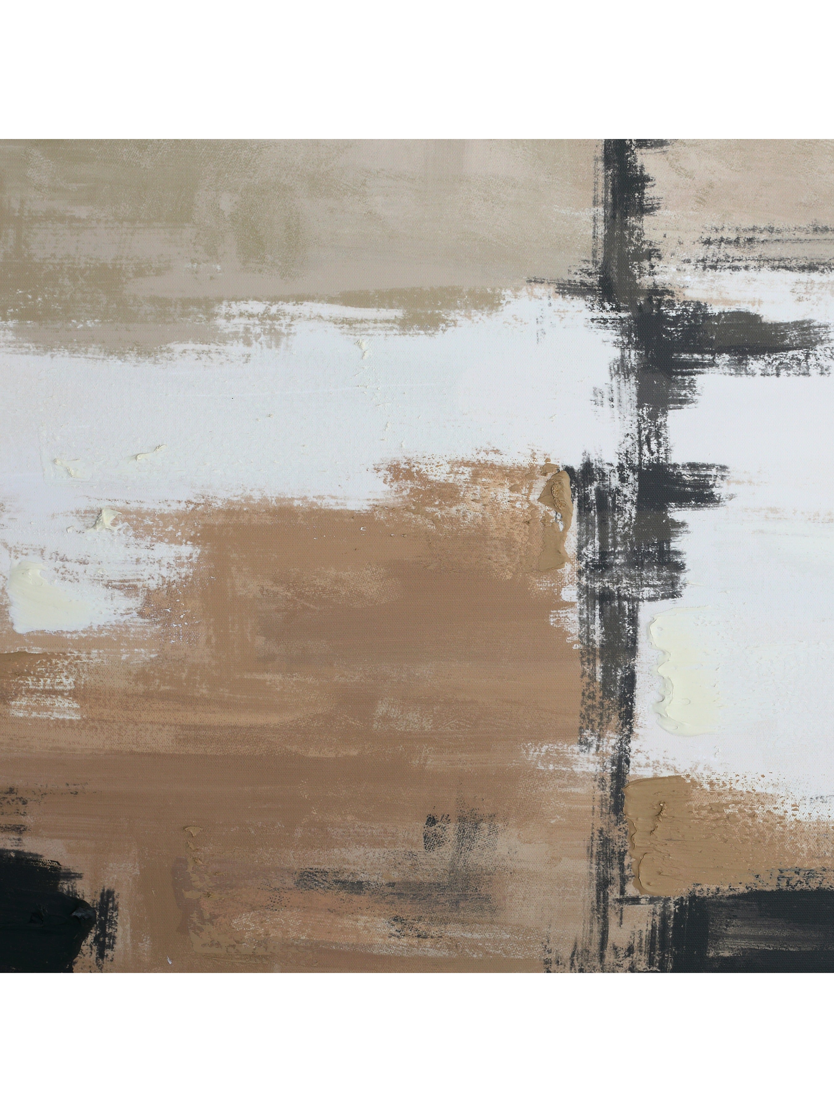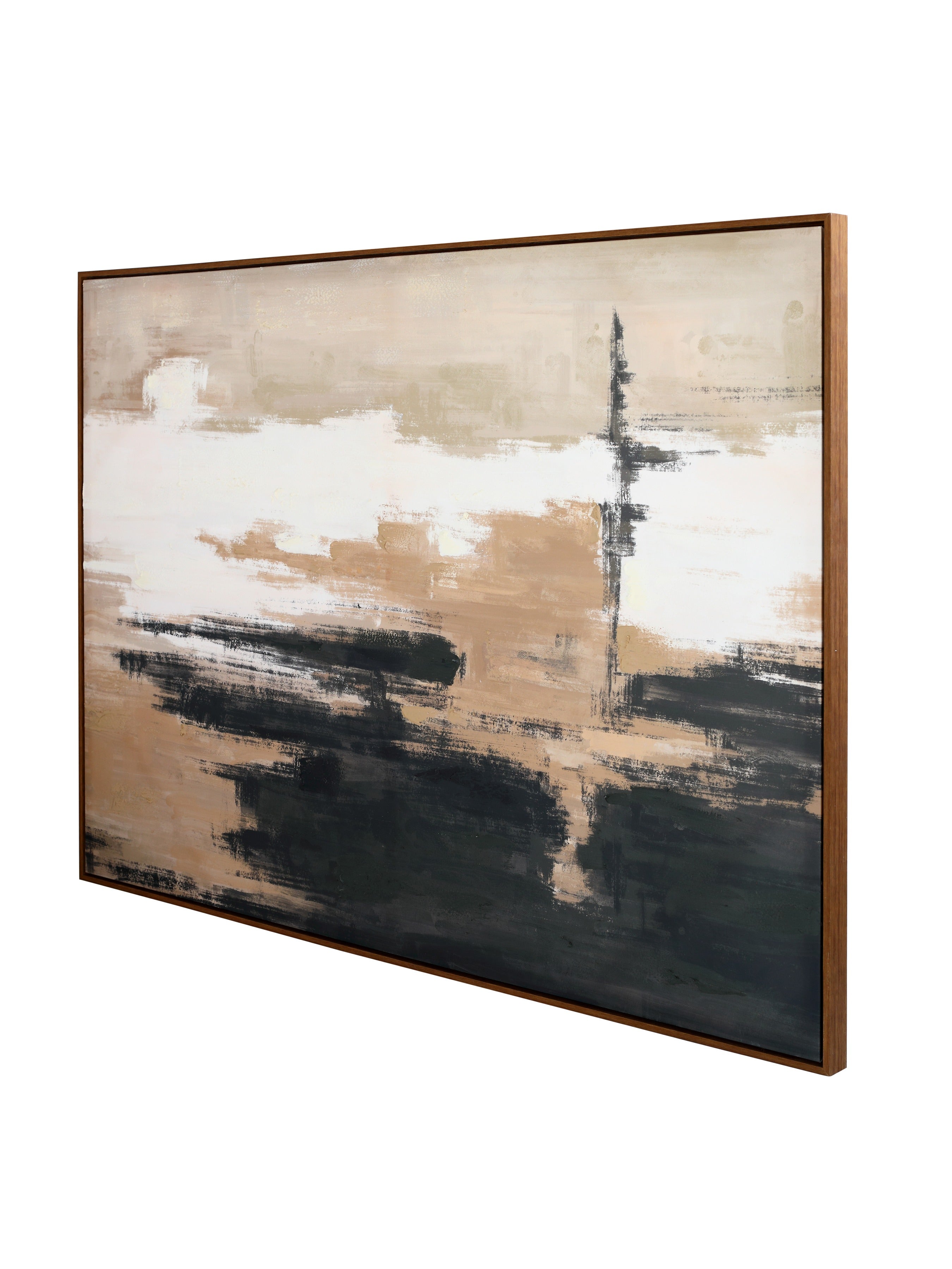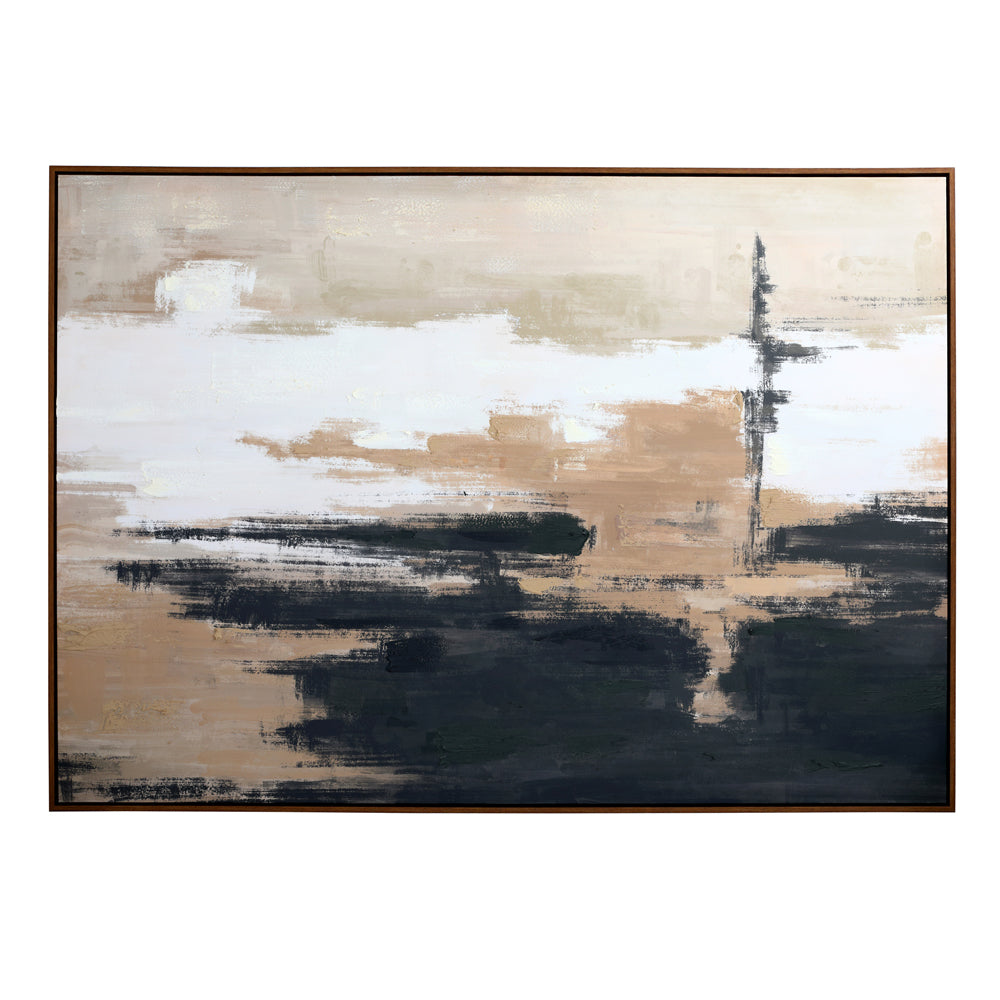 Hand-embellished for added texture and depth, this striking artwork showcases sweeping brushstrokes in muted earthy tones of sand, ivory, and charcoal. The horizontal composition and layered finish evoke a tranquil landscape, creating a grounded, soothing atmosphere in living rooms, bedrooms, or hallways.