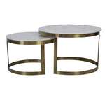 The instant glamour and luxe of the Perlato Coffee Tables in something to be admired. They are an instant showstopper with elegance coming from every part. Begin with the polished golden metal bases and their perfect curves. Both of the table tops are creamy white pure marble. As a natural stone, each one shows off veins and flecks unique to that single piece. These two tables store as a single unit together. Pull out the smaller table when needed or use them separately in your home.