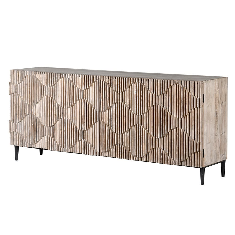 Those wonderfully wavy lines may evoke the sea, leaves, or abstract geometry. One thing is certain, this is a sideboard which sticks in the memory! The reclaimed pine from which it is constructed has been skilfully carved, given a grey wash, and fitted out inside with two capacious shelves. Offering solid functionality and a small design accent, the iron legs will hold up whatever you store inside for as long as you need.