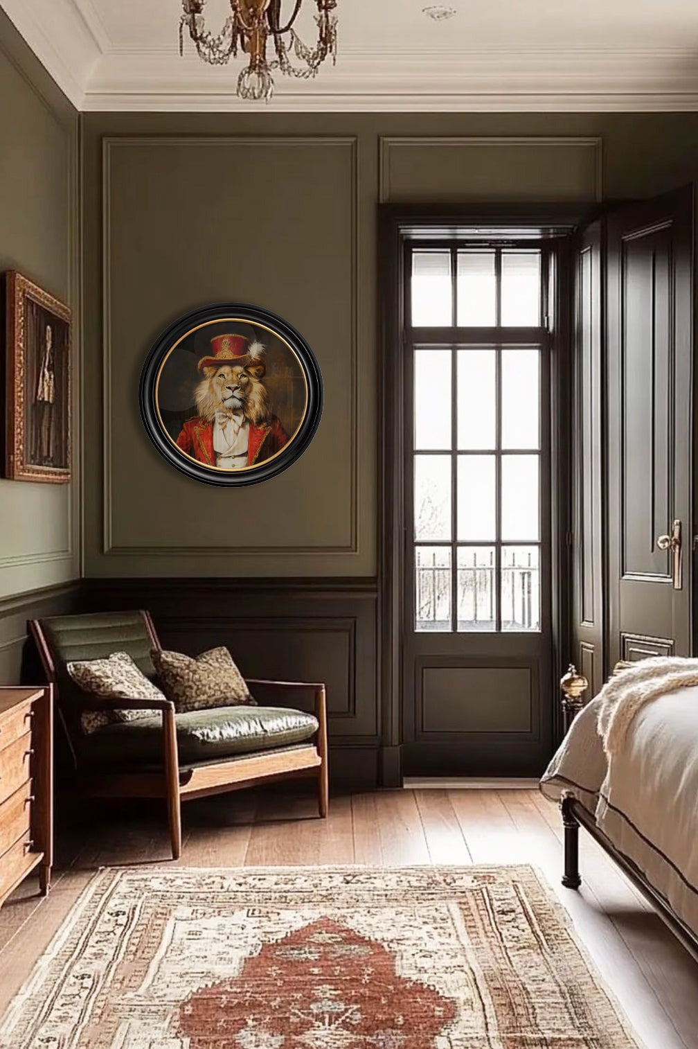 This playful portrait reimagines traditional aristocratic art with a surreal twist, featuring a dapper lion dressed in full regalia, complete with waistcoat, bowtie, and hat. Set against a moody background and framed in a classic black round frame with gold trim, it blends humour with old-world elegance.