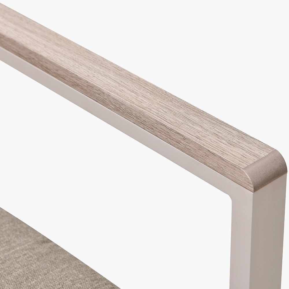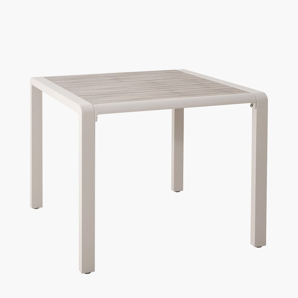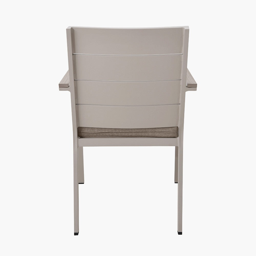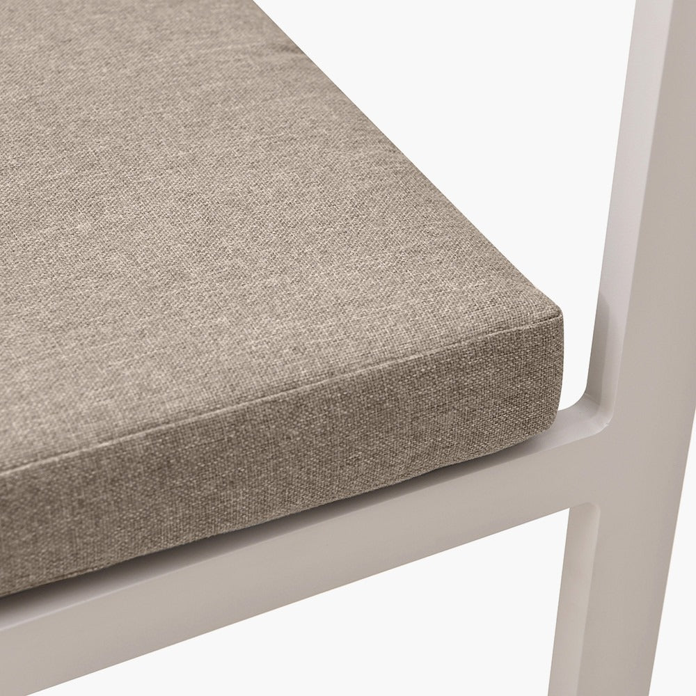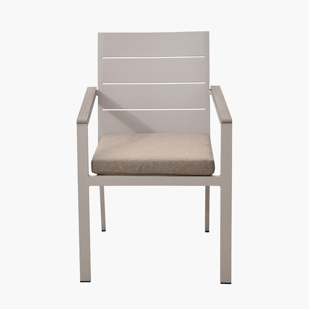 Featuring a sleek dining table with latte-toned, powder-coated aluminium legs and an ash-coloured polywood top, this modern set pairs clean design with calming neutral tones. Four matching chairs complete the ensemble, each designed for comfort and style with coordinating frames and soft, neutral cushions.