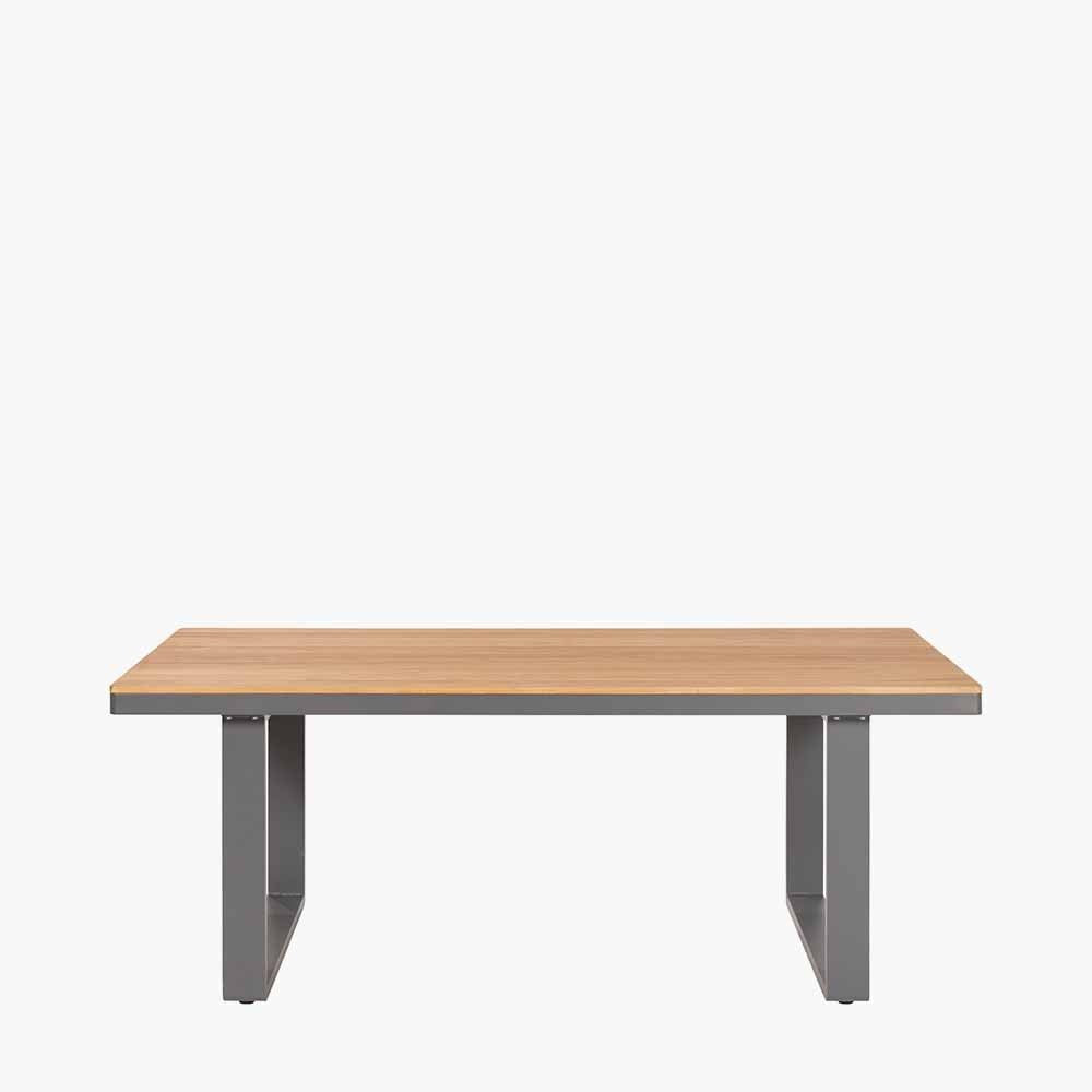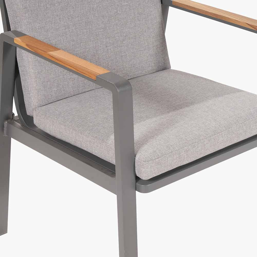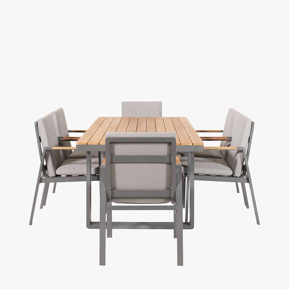 This stunning set features a rectangular dining that table pairs a warm slatted teak wood top with a powder-coated aluminium frame in a soft anthracite finish, offering durability with a contemporary edge. Six chairs echo the table’s sleek silhouette, each finished with matching frames and generously padded Linen Blend Marl Grey cushions for a comfortable, laid-back feel.