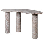 Crafted from exquisite marble, it showcases rich earthy tones and intricate natural veining that make every piece unique. Three solid column legs support an organically shaped top, providing generous space for your laptop, notes, and essentials while exuding sculptural elegance. It brings an instant sense of refinement and luxury to any room.