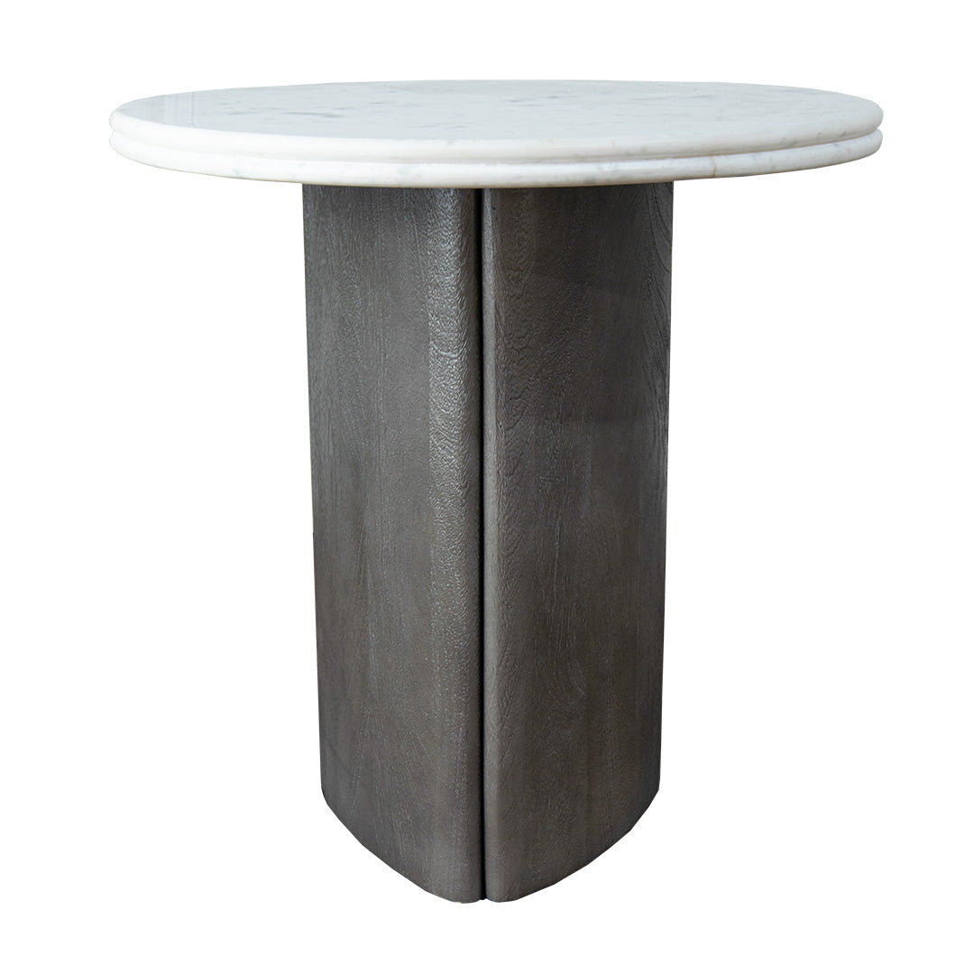 Supported by a distinctive pedestal base in grey-stained wood, it highlights the natural grain for subtle, organic appeal. The smooth, round white marble top adds a refined contrast, offering a polished surface for everyday essentials or your favourite decorative pieces.