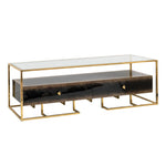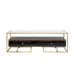 Its angular brass-finished frame delivers striking geometric appeal, while the eggshell inlay on the drawers adds rich texture and visual interest. Two spacious drawers provide discreet storage, each accented with unique sculptural handles that offer a luxurious, artisanal touch. The sleek glass top is ideal for displaying décor or supporting your entertainment setup.