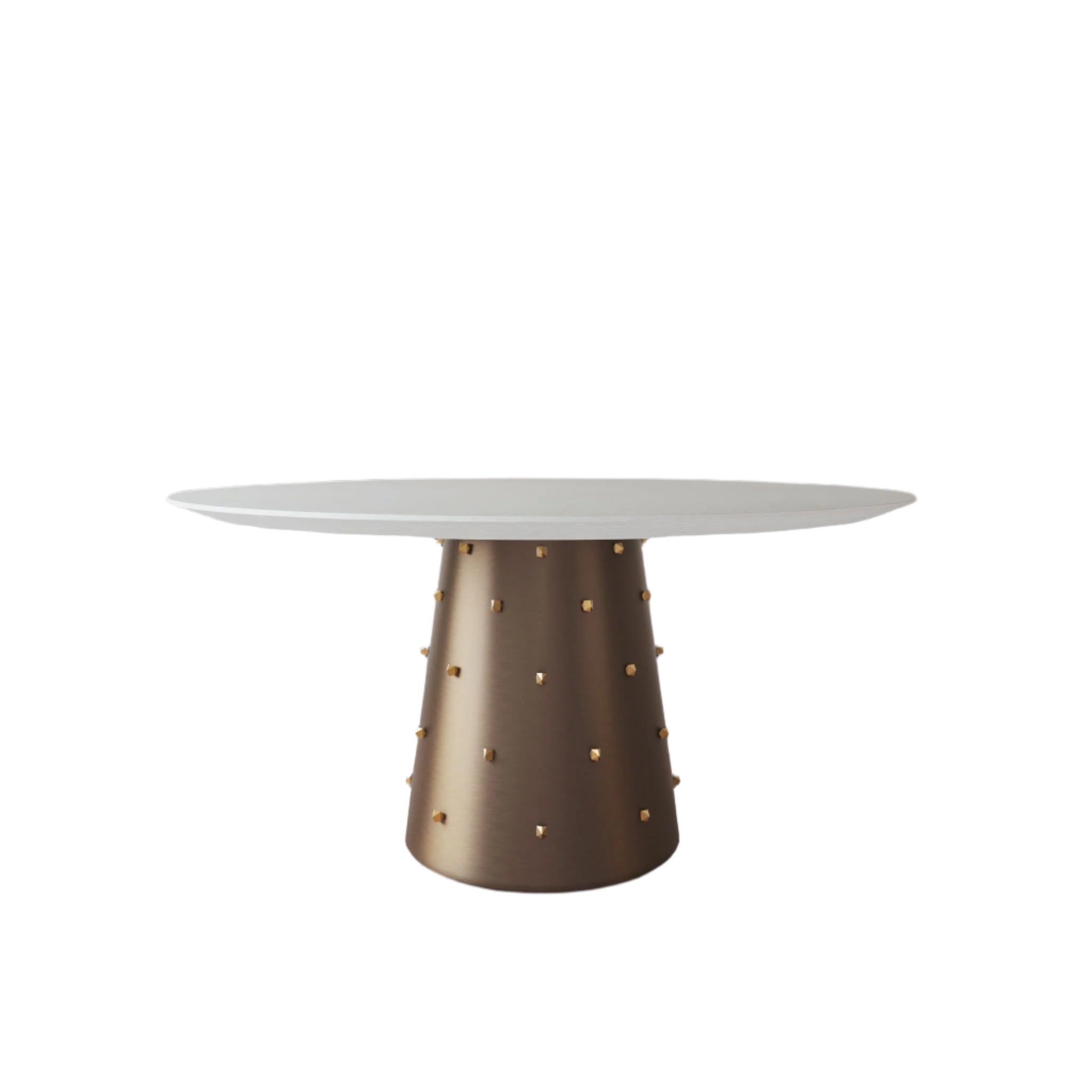 Its round grey oak tabletop offers a sleek, contemporary aesthetic, while the conical stainless steel base ensures both stability and style. Finished in warm antique brass, the base is adorned with irregular-shaped studs, adding an unexpected touch of industrial-chic sophistication.