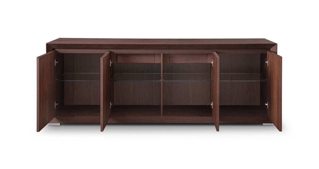 Crafted with a rich walnut veneer finish, it showcases clean lines, tapered edges, and a warm tone that exudes classic sophistication. Behind its four doors lies generous shelved storage, perfect for organising dinnerware, linens, or everyday essentials, while the smooth top provides ample space for displaying art, glassware, or decorative accents.