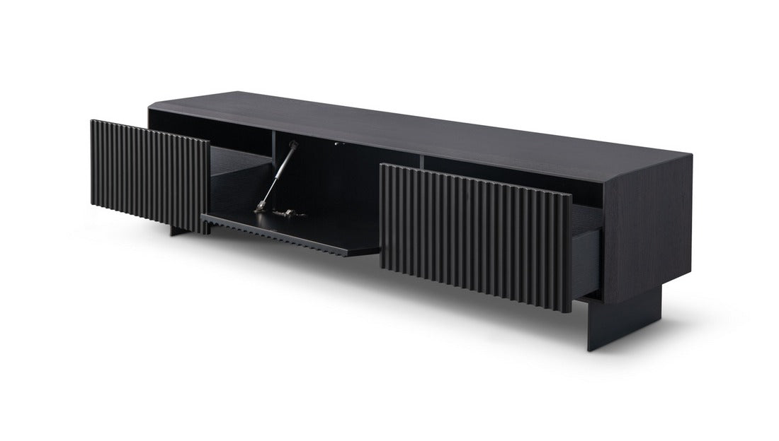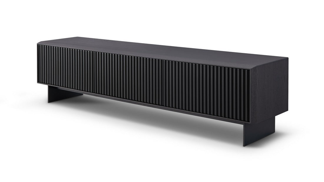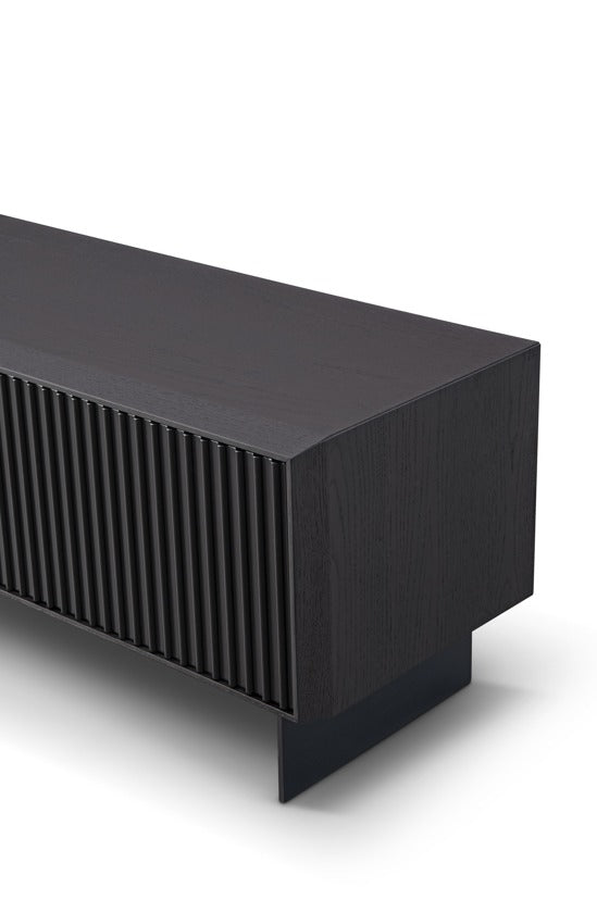 Crafted from smoke oak with a sleek lacquered finish, it features a distinctive ribbed front that adds depth, texture, and architectural flair. Ample concealed storage ensures your entertainment essentials remain neatly tucked away, helping maintain a clean, streamlined aesthetic.